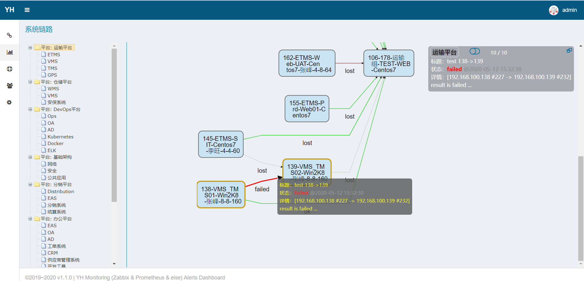 【系统链路】根据各平台、系统内的各主机主动上报的检测数据,自动生成主机连接关系图,直观反映系统内的连接状态,效果图如下(图为模拟连接数据):